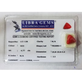 REPORT NO . LCI 138CLARITY . N/ACOLOUR . REDSHAPE / CUT . TRIANGLEWT . 4.77 CTSDIMENSION . 10-8.10-6.5-9.R . INDEX . N/AHARDNESS . 3.5COMMENT . CORAL..