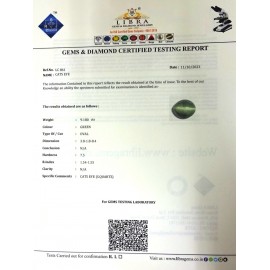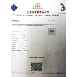 REPORT.NO.-LC 523CLARITY.-N/ACOLOUR.-GREENSHAPE/CUT.-OVALWT.-4.80 CTSDIMENSION.-1-9.8-8.6-5.R.INDEX.-1.54-1.55HARDNESS.-7.5COMMENT.-CATS EYE { S . QUARTZ }..