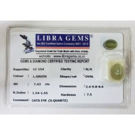 REPORT NO . LC 154CLARITY . N/ACOLOUR . L . GREENSHAPE / CUT . OVALWT . 7.43 CTSDIMENSION . 2-4.9-8.8-8.R . INDEX . 1.54-1.55HARDNESS . 7.5COMMENT . CATS EYE { S . QUARTZ }..