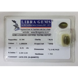 REPORT NO . LC 84CLARITY . N/ACOLOUR . L. GREENSHAPE / CUT . OVALWT . 4.31 CTSDIMENSION . 1-1.8-3.6-5.R . INDEX . 1.54-1.55HARDNESS . 7.5COMMENT . CATS EYE { S . SQUARTZ }..
