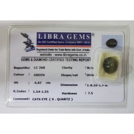 REPORT NO . LC 268CLARITY . N/ACOLOUR . GREENSHAPE / CUT . OVALWT . 6.87 CTSDIMENSION . 1-8.10-1.7-8.R . INDEX . 1.54-1.55HARDNESS . 7.5COMMENT . CATS EYE { S . QUARTZ }..