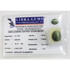 REPORT.NO.-LC 335CLARITY.-N/ACOLOUR.-GREENSHAPE/CUT.-OVALWT.-8.13 CTSDIMENSION.-4-1.1-7.7-2.R.INDEX.-1.54-1.55HARDNESS.-7.5COMMENT.-CATS EYE { S . QUARTZ }..