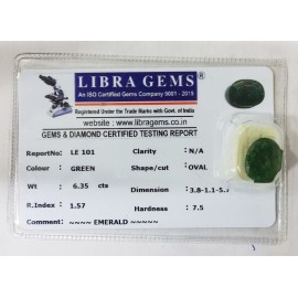 REPORT NO . LE 101CLARITY . N/ACOLOUR . GREENSHAPE / CUT . OVALWT . 6.35 CTSDIMENSION . 3-8.1-1.5-7.R . INDEX . 1.57HARDNESS . 7.5COMMENT . EMERALD..