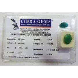 REPORT.NO.LE 444CLARITY.N/ACOLOUR.GREENSHAPE/CUT.OVALWT.4.01 CTSDIMENSION. 5-2.2-1.9-1.R.INDEX.1.57HARDNESS.7.5COMMENT.EMERALD..