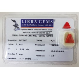REPORT NO . LCI 107CLARITY . N/ACOLOUR . REDSHAPE / CUT . TRIANGLEWT . 2.96 CTSDIMENSION . 10-3.10-2.4-5.R . INDEX . N/AHARDNESS . 3.5COMMENT . CORAL..