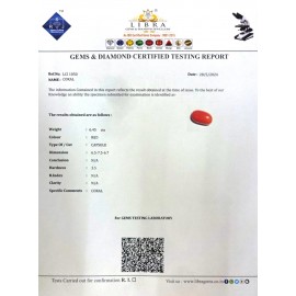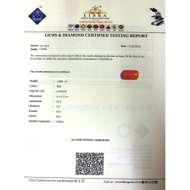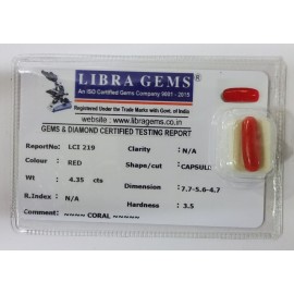 REPORT NO . LCI 219CLARITY . N/ACOLOUR . REDSHAPE / CUT . CAPSULEWT . 4.35 CTSDIMENSION . 7-7.5-6.4-7.R . INDEX . N/AHARDNESS . 3.5COMMENT . CORAL..