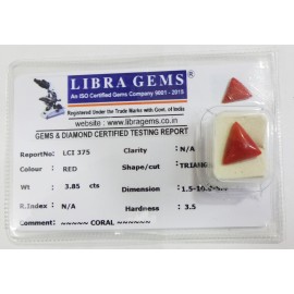 REPORT NO . LCI 375CLARITY . N/ACOLOUR . REDSHAPE / CUT . TRIANGLEWT . 3.85 CTSDIMENSION . 1-5.10-9.5-4.R . INDEX . N/AHARDNESS . 3.5COMMENT . CORAL..