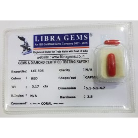REPORT.NO.LCI 505CLARITY.N/ACOLOUR.REDSHAPE/CUT.CAPSULEWT.3.17 CTSDIMENSION.5.1-5.1-4.7R.INDEX.N/AHARDNESS.3.5COMMENT.CORAL..