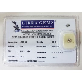 REPORT NO . LDM 19CLARITY . SI-1COLOUR . G-JSHAPE / CUT . ROUNDWT . 0.41 CTSDIMENSION . 4-7.2-9.4-7.R . INDEX . 2.42HARDNESS . 10.0COMMENT . DIAMOND..
