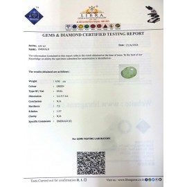 REPORT.NO.-LE 726CLARITY.-N/ACOLOUR.-GREENSHAPE/CUT.-OVALWT.-4.27 CTSDIMENSION.-2-3.9-2.4-8.R.INDEX.-1.57HARDNESS.-7.5COMMENT.-EMERALD..