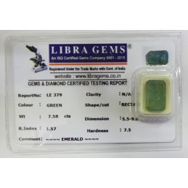 REPORT.NO.LE 379CLARITY.N/ACOLOUR.GREENSHAPE/CUT.RECTANGLEWT.7.58 CTSDIMENSION. 5-5.9-9.5-1.R.INDEX.1.57HARDNESS.7.5COMMENT.EMERALD..