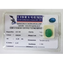 REPORT NO . LEJ 58CLARITY . N/ACOLOUR . GREENSHAPE / CUT . OVALWT . 4.20 CTSDIMENSION . 2-2.9-7.5-1.R . INDEX . 1.57HARDNESS . 7.5COMMENT . EMERALD { J }..
