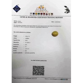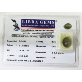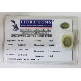 REPORT NO . LC 59CLARITY . N/ACOLOUR . L . GREENSHAPE / CUT . OVALWT . 5.96 CTSDIMENSION . 2-7.6-7.9-7.R . INDEX . 1.54-1.55HARDNESS . 7.5COMMENT . CATS EYE { S . QUARTZ }..