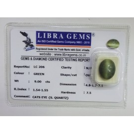 REPORT NO . LC 206CLARITY . N/ACOLOUR . GREENSHAPE / CUT . OVALWT . 9.00 CTSDIMENSION . 4-8.1-7.7-1.R . INDEX . 1.54-1.55HARDNESS . 7.5COMMENT . CATS EYE { S . QUARTZ }..
