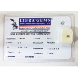 REPORT NO . LDM 10CLARITY . SI-1COLOUR . G-JSHAPE / CUT . ROUNDWT . 0.34 CTSDIMENSION . 4-3.3-1.4-3.R . INDEX . 2.42HARDNESS . 10.0COMMENT . DIAMOND..