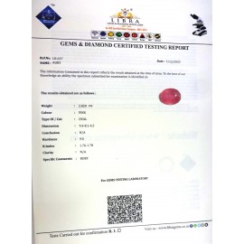 REPORT.NO.-LR 380CLARITY.-N/ACOLOUR.-PINKSHAPE/CUT.-OVALWT.-9.40 CTSDIMENSION.-5-1.2-1.4-7.R.INDEX.-1.76-1.78HARDNESS.-9.0COMMENT.-RUBY..