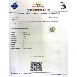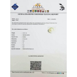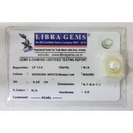 REPORT NO . LP 114CLARITY . N/ACOLOUR . SHINING WHITESHAPE / CUT . ROUNDWT . 4.16 CTSDIMENSION . 8-7.8-6.7-2.R . INDEX . N/AHARDNESS . 3.0COMMENT . PEARL..