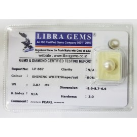 REPORT NO . LP 887CLARITY . N/ACOLOUR . SHINING WHITESHAPE / CUT . ROUNDWT . 3.87 CTSDIMENSION . 8-6.8-7.6-6.R . INDEX . N/AHARDNESS . 3.0COMMENT . PEARL..