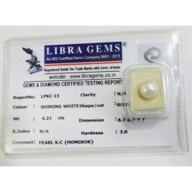 REPORT.NO.-LPKC 15CLARITY.-N/ACOLOUR.-SHINING WHITESHAPE/CUT.-ROUNDWT.-4.21 CTSDIMENSION.-8-7.8-7.7-7.R.INDEX.-N/AHARDNESS.-3.0COMMENT.-PEARL K.C { HONGKOK }..