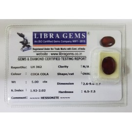 REPORT.NO.-LH 362CLARITY.-N/ACOLOUR.-COCA COLASHAPE/CUT.-OVALWT.-5.00 CTSDIMENSION.-2-6.9-6.4-7.R.INDEX.-1.92-2.02HARDNESS.-6.5-7.5COMMENT.-HESSONITE..