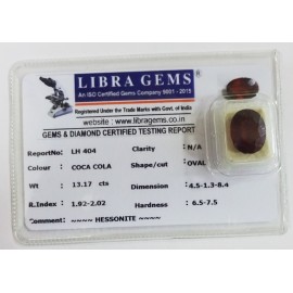 REPORT.NO.-LH 404CLARITY.-N/ACOLOUR.-COCA COLASHAPE/CUT.-OVALWT.-13.17 CTSDIMENSION.-4-5.1-3.8-4.R.INDEX.-1.92-2.02HARDNESS.-6.5-7.5COMMENT.-HESSONITE..