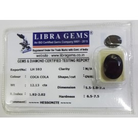 REPORT.NO.-LH 593CLARITY.-N/ACOLOUR.-COCA COLASHAPE/CUT.-OVALWT.-12.13 CTSDIMENSION.-5-5.1-9.7-1.R.INDEX.-1.92-2.02HARDNESS.-6.5-7.5COMMENT.-HESSONITE..