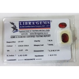 REPORT NO . LH 67CLARITY . N/ACOLOUR . COCA COLASHAPE / CUT . OVALWT . 3.07 CTSDIMENSION . 1-2.8-2.3-6.R . INDEX . 1.92-2.02HARDNESS . 6.5-7.5COMMENT . HESSONITE..