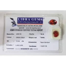 REPORT NO . LHS 95CLARITY . N/ACOLOUR . COCA COLASHAPE / CUT . OVALWT . 3.16 CTSDIMENSION . 9-4.7-9.5-4.R . INDEX . 1.92-2.02HARDNESS . 6.5-7.5COMMENT . HESSONITE { S }..