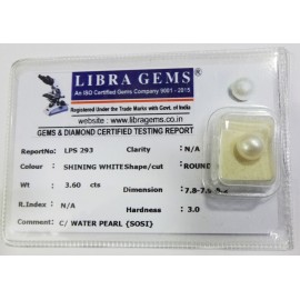 REPORT.NO.-LPS 293CLARITY.-N/ACOLOUR.-SHINING WHITESHAPE/CUT.-ROUNDWT.-3.60 CTSDIMENSION.-7-8.7-9.8-2.R.INDEX.-N/AHARDNESS.-3.0COMMENT.-C / WATER PEARL { SOSI }..