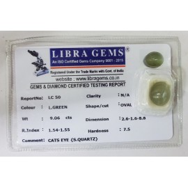REPORT NO . LC 50CLARITY . N/ACOLOUR . L . GREENSHAPE / CUT . ROUNDWT . 9.06 CTSDIMENSION . 2-6.1-6.8-8.R . INDEX . 1.54-1.55HARDNESS . 7.5COMMENT . CATS EYE { S . SQUARTZ }..