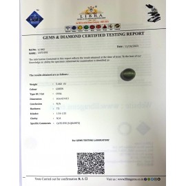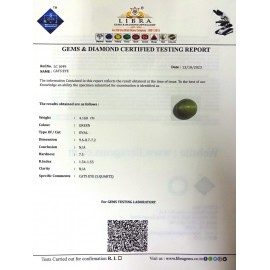 REPORT.NO.-LC 695CLARITY.-N/ACOLOUR.-GREENSHAPE/CUT.-OVALWT.-5.20 CTSDIMENSION.-2-1.9-9.6-5.R.INDEX.-1.54-1.55HARDNESS.-7.5COMMENT.-CATS EYE { S. QUARTZ }..