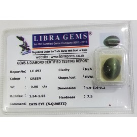 REPORT.NO.-LC 493CLARITY.-N/ACOLOUR.-GREENSHAPE/CUT.-OVALWT.-9.90 CTSDIMENSION.-3-9.1-4.9-2.R.INDEX.-1.54-1.55HARDNESS.-7.5COMMENT.-CATS EYE { S . QUARTZ }..