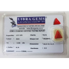 REPORT NO . LCI 105CLARITY . N/ACOLOUR . REDSHAPE / CUT . TRIANGLEWT . 3.56 CTSDIMENSION . 10-5.9-3.6-3.R . INDEX . N/AHARDNESS .3.5COMMENT . CORAL..