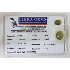 REPORT NO . LC 68CLARITY . N/ACOLOUR . L . GREENSHAPE / CUT . OVALWT . 5.48 CTSDIMENSION . 2-2.10-9.6-1.R . INDEX . 1.54-1.55HARDNESS . 7.5COMMENT . CATS EYE { S . QUARTZ }..