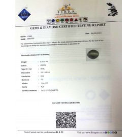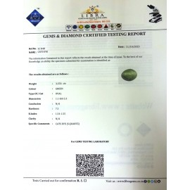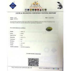REPORT.NO.-LC 695CLARITY.-N/ACOLOUR.-GREENSHAPE/CUT.-OVALWT.-5.20 CTSDIMENSION.-2-1.9-9.6-5.R.INDEX.-1.54-1.55HARDNESS.-7.5COMMENT.-CATS EYE { S. QUARTZ }..