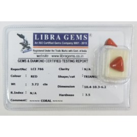 REPORT.NO.-LCI 786CLARITY.-N/ACOLOUR.-REDSHAPE/CUT.-TRIANGLEWT.-3.72 CTSDIMENSION.-10-4.10-3.6-2.R.INDEX.-N/AHARDNESS.35COMMENT.-CORAL..