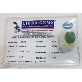 REPORT NO . LEJ 76CLARITY . N/ACOLOUR . GREENSHAPE / CUT . OVALWT . 6.42 CTSDIMENSION . 4-3.10-7.6-1.R . INDEX .1.57HARDNESS . 7.5COMMENT . EMERALD { J }..