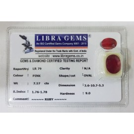 REPORT NO . LR 79CLARITY . N/ACOLOUR . PINKSHAPE / CUT . OVALWT . 7.57 CTSDIMENSION . 3-6.10-7.5-3.R . INDEX . 1.76-1.78HARDNESS . 9.0COMMENT . RUBY..