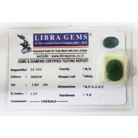 REPORT.NO.-LE 231CLARITY.-N/ACOLOUR.-GREENSHAPE/CUT.-OVALWT.-7.87 CTSDIMENSION.-4-7.1-3.6-4.R.INDEX.-1.57HARDNESS.-7.5COMMENT.-EMERALD..