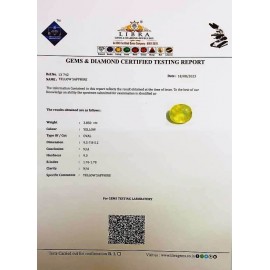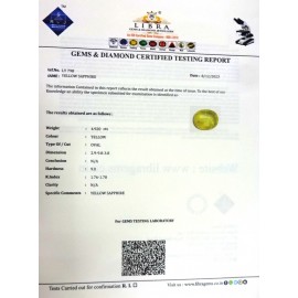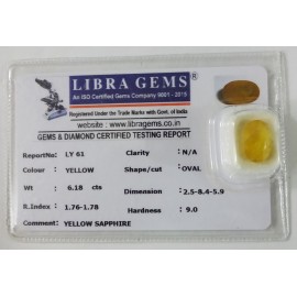 REPORT NO . LY 61CLARITY . N/ACOLOUR . YELLOWSHAPE / CUT . OVALWT . 6.18 CTSDIMENSION . 2-5.8-4.5-9.R . INDEX . 1.76-1.78HARDNESS . 9.0COMMENT . YELLOW SAPPHIRE..