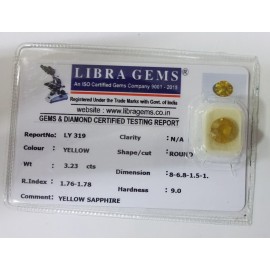 REPORT NO . LY 319CLARITY . N/ACOLOUR . YELLOWSHAPE / CUT . ROUNDWT . 3.23 CTSDIMENSION . 8-6.8-1.5-1.R . INDEX . 1.76-1.78HARDNESS . 9.0COMMENT . YELLOW SAPPHIRE..