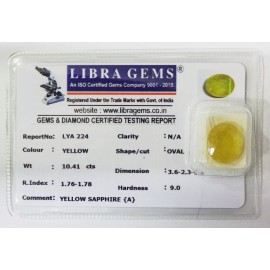 REPORT.NO.-LYA 224CLARITY.-N/ACOLOUR.-YELLOWSHAPE/CUT.-OVALWT.-10.41 CTSDIMENSION.-3-6.2-3.5-8.R.INDEX.-1.76-1.78HARDNESS.-9.0COMMENT.-YELLOW SAPPHIRE { A }..