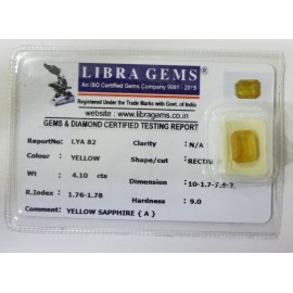 REPORT.NO.LYA 82CLARITY.N/ACOLOUR.YELLOWSHAPE/CUT.RECTANGLEWT.4.10 CTSDIMENSION.10.1-7.7-4.2R.INDEX.1.76-1.78HARDNESS.9.0COMMENT.YELLOW SAPPHIRE {A}..