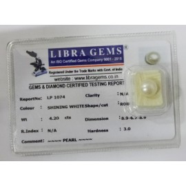 REPORT NO . LP 1074CLARITY . N/ACOLOUR . SHINING WHITESHAPE / CUT . ROUNDWT . 4.20 CTSDIMENSION . 8-9.6-7.8-9.R . INDEX . N/AHARDNESS . 3.0COMMENT . PEARL..