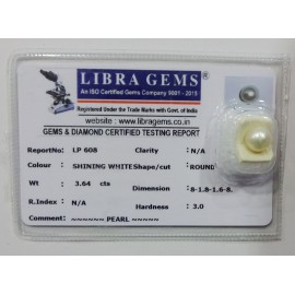 REPORT NO . LP 608CLARITY . N/ACOLOUR . SHINING WHITESHAPE / CUT . ROUNDWT . 3.64 CTSDIMENSION . 8-1.8-1.6-8.R . INDEX . N/AHARDNESS . 3.0COMMENT . PEARL..