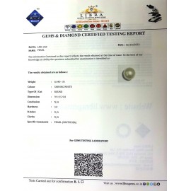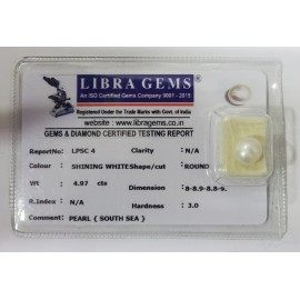 REPORT NO . LPSC 4CLARITY . N/ACOLOUR . SHINING WHITESHAPE / CUT . ROUNDWT . 4.97 CTSDIMENSION . 8-8.9-8.8-9.R . INDEX . N/AHARDNESS . 3.0COMMENT . PEARL { SOUTH SEA }..