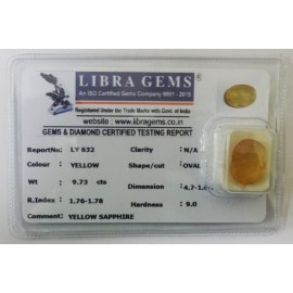 REPORT NO . LY 94CLARITY . N/ACOLOUR . YELLOWSHAPE / CUT . OVALWT . 7.19 CTSDIMENSION . 10-7.3-7.4-5.R . INDEX . 1.76-1.78HARDNESS . 9.0COMMENT . YELLOW SAPPHIRE..