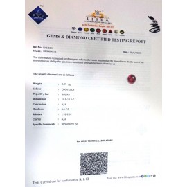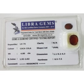 REPORT NO . LH 76CLARITY . N/ACOLOUR . COCA COLASHAPE / CUT . OVALWT . 4.00 CTSDIMENSION . 1-1.9-2.4-3.R . INDEX . 1.92-2.02HARDNESS . 6.5-7.5COMMENT . HESSONITE..