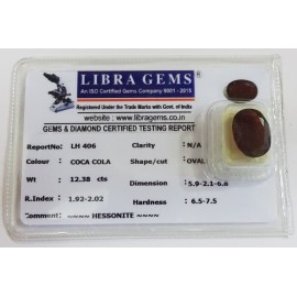 REPORT.NO.-LH 406CLARITY.-N/ACOLOUR.-COCA COLASHAPE/CUT.-OVALWT.-12.38 CTSDIMENSION.-5-9.2-1.6-8.R.INDEX.-1.92-2.02HARDNESS.-6.5-7.5COMMENT.-HESSONITE..
