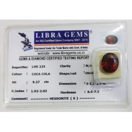 REPORT.NO.LHS 225CLARITY.N/ACOLOUR.COCA COLASHAPE/CUT.OVALWT.9.27CTS DIMENSION.3.1-1.1-7.6R.INDEX.1.92-2.02HARDNESS.6.5-7.5COMMENT.HESSONITE {S}..